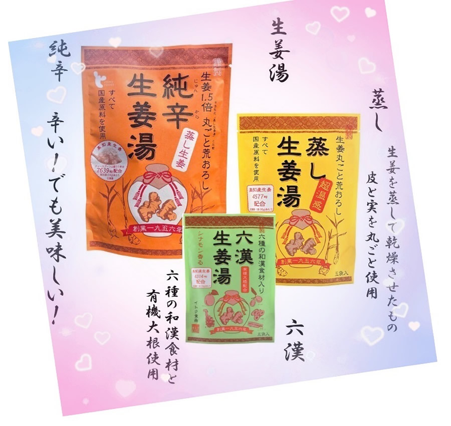 蒸し生姜湯、六漢生姜湯、純辛生姜湯の3種類あります。