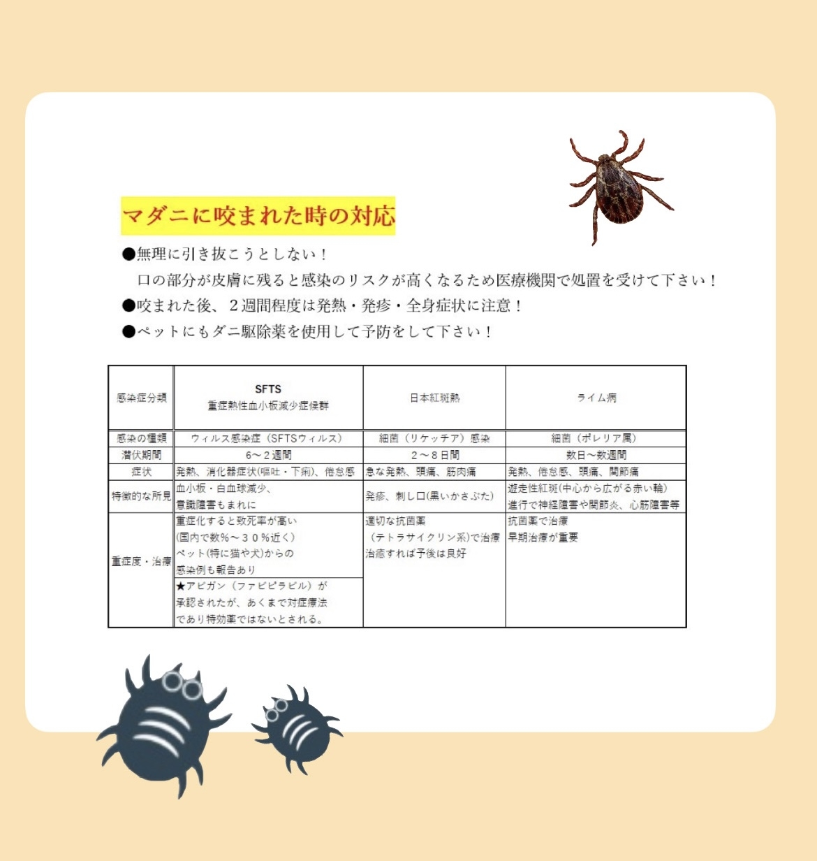 マダニに咬まれたらどうしたらいいの??・・・SFTS【重症熱性血小板減少症候群】って何?・・・